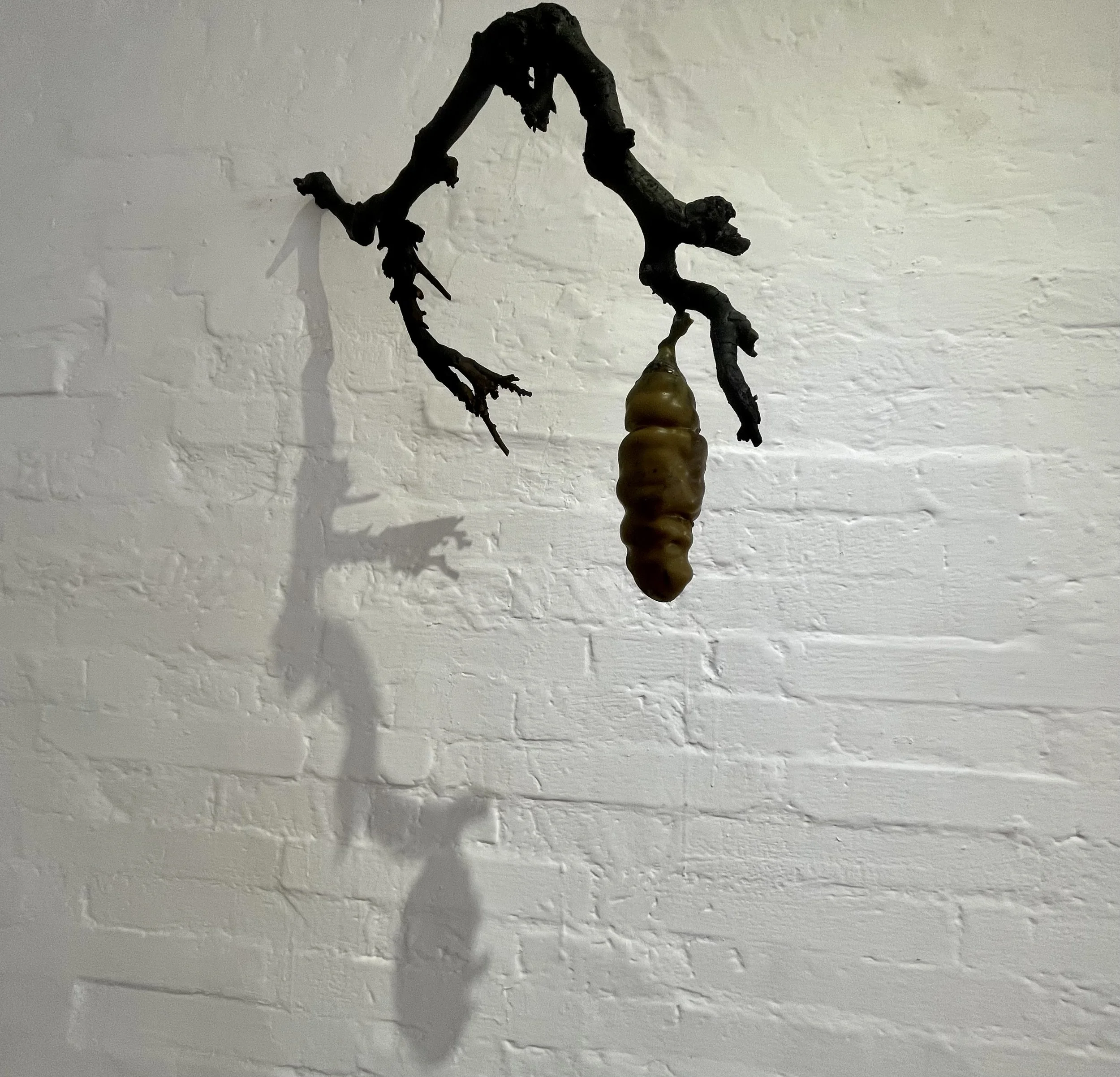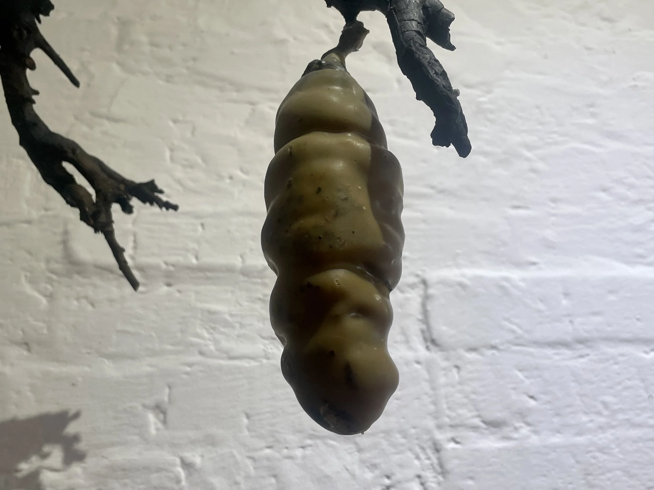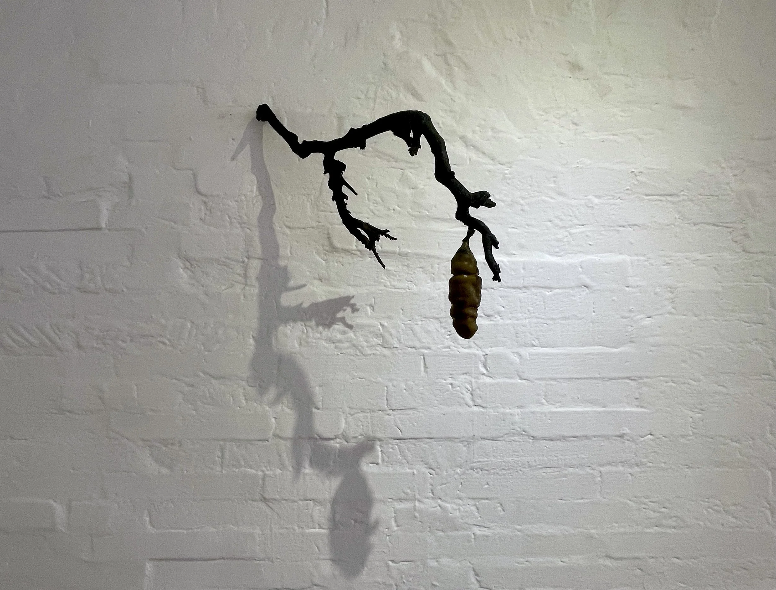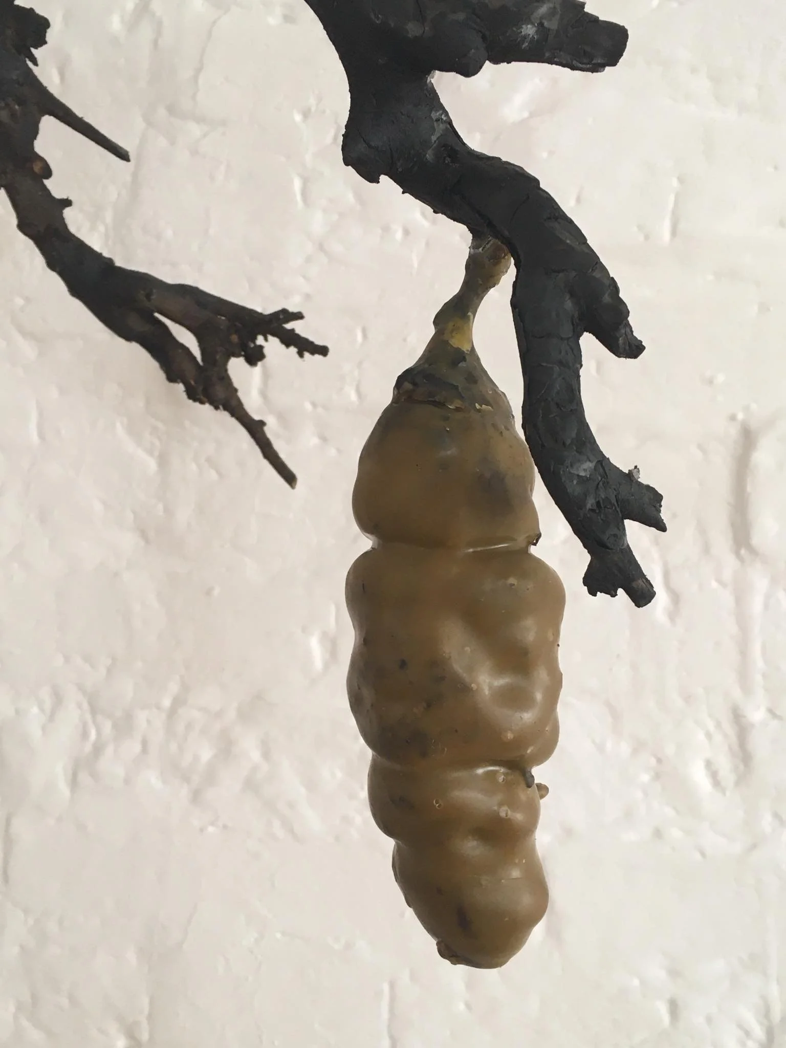 Burnt apple branch, cocoa seeds wrapped in beeswax