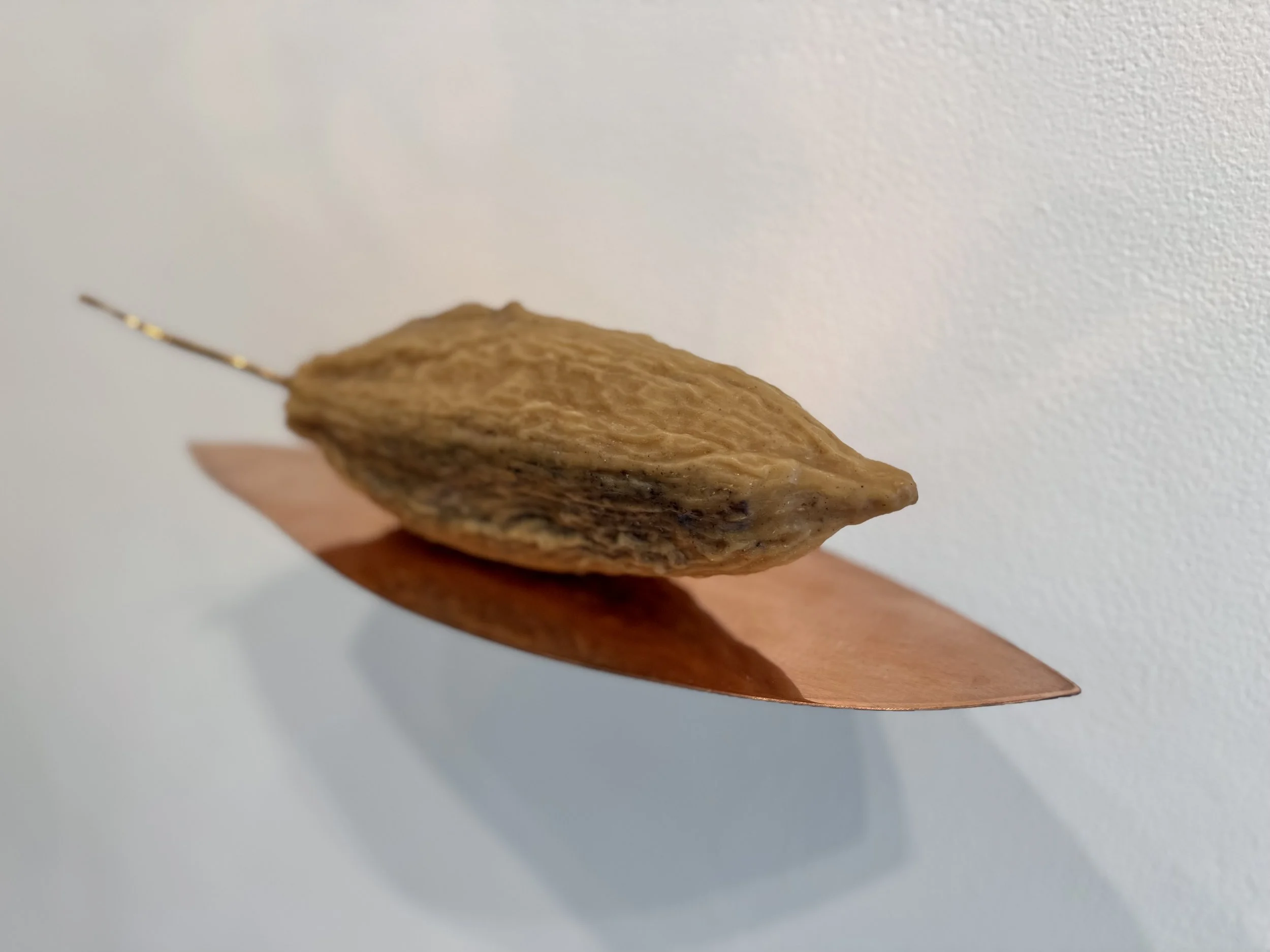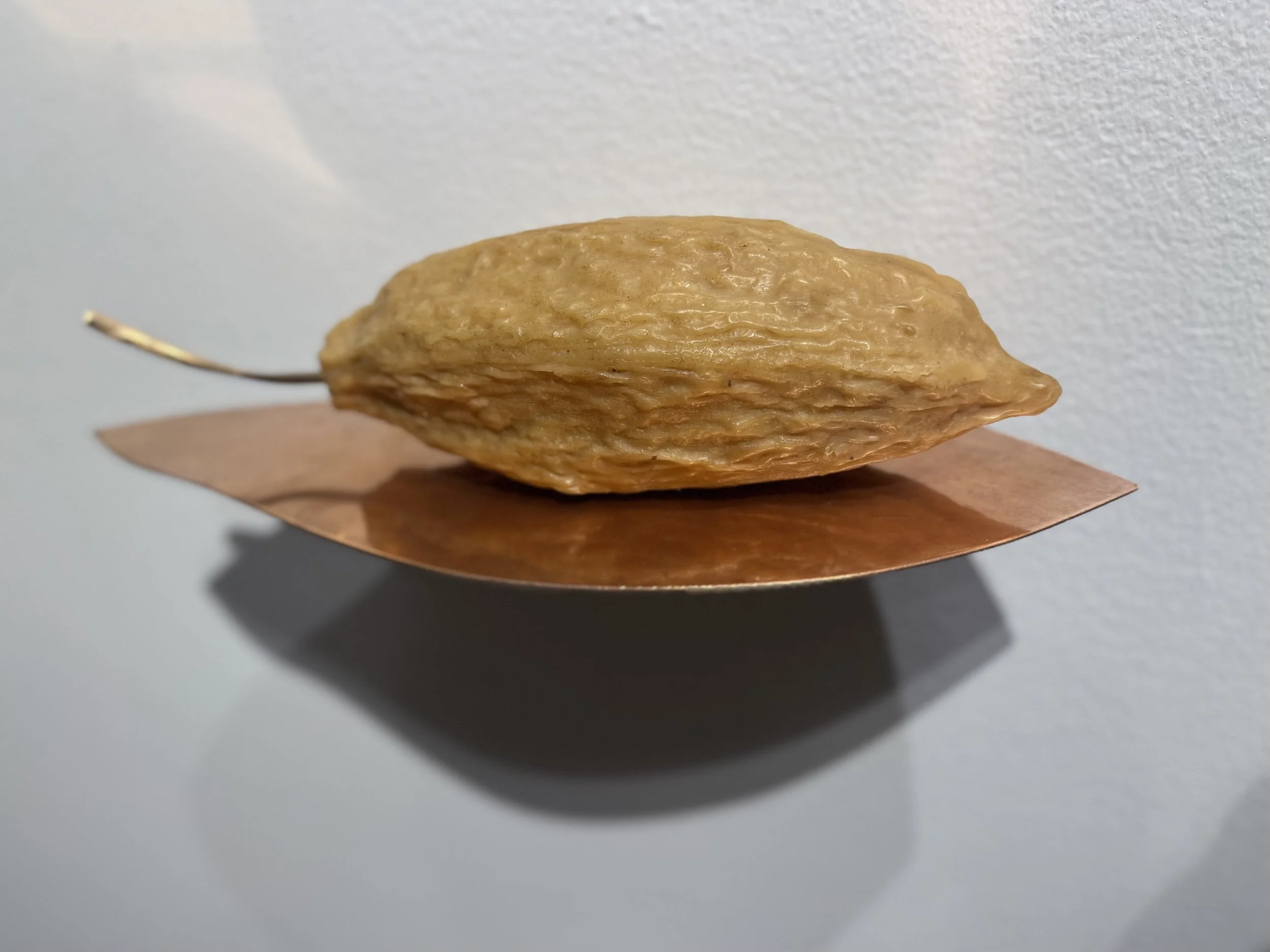 Sculptures in the form of cacao, crafted in beeswax with bronze detailing on copper plates. Series of three.